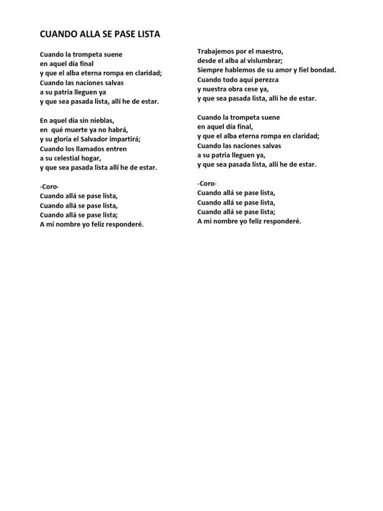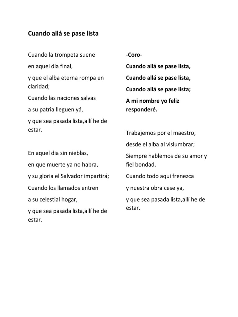 Cuando allá se pase lista A mi nombre yo feliz responderé. Allá se pase lista cuando Allá se pase lista. A mi nombre Yo feliz responderé 2da estrofa En aquel día sin niebla en que muerte Ya no habrá y su gloria el Salvador impartirá.